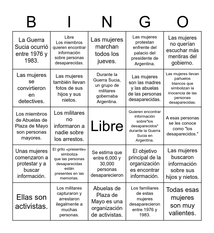 This bingo card has a free space and 24 words: El grito «presente» simboliza que las personas desaparecidas están presentes en las memorias., Los militares capturaron y arrestaron ilegalmente a muchas personas., Durante la Guerra Sucia, un grupo de militares gobernaba Argentina., Ellas son activistas., Las mujeres no querían escuchar más mentiras del gobierno., La Guerra Sucia ocurrió entre 1976 y 1983., Las mujeres se convirtieron en detectives., Libre Los miembros quieren encontrar información sobre personas desaparecidas., Quieren encontrar información sobre"los desaparecidos" durante la Guerra Sucia en Argentina., Se estima que entre 6,000 y 30,000 personas desaparecieron, Las mujeres son las madres y las abuelas de las personas desaparecidas., Los miembros de Abuelas de Plaza de Mayo son personas mayores., El objetivo principal de la organización es encontrar información., Las mujeres buscaron información sobre sus hijos y nietos., Las mujeres también llevan fotos de sus hijos y sus nietos., Los familiares de estas mujeres desaparecieron entre 1976 y 1983., A esas personas se les conoce como "los desaparecidos.", Las mujeres marchan todos los jueves., Las mujeres llevan pañuelos blancos que simbolizan la inocencia de las personas desaparecidas., Los militares no informaron a nadie sobre los arrestos., Todas esas mujeres son muy valientes., Unas mujeres comenzaron a protestar y a buscar información., Las mujeres protestan enfrente del palacio del presidente de Argentina. and Abuelas de Plaza de Mayo es una organización de activistas..