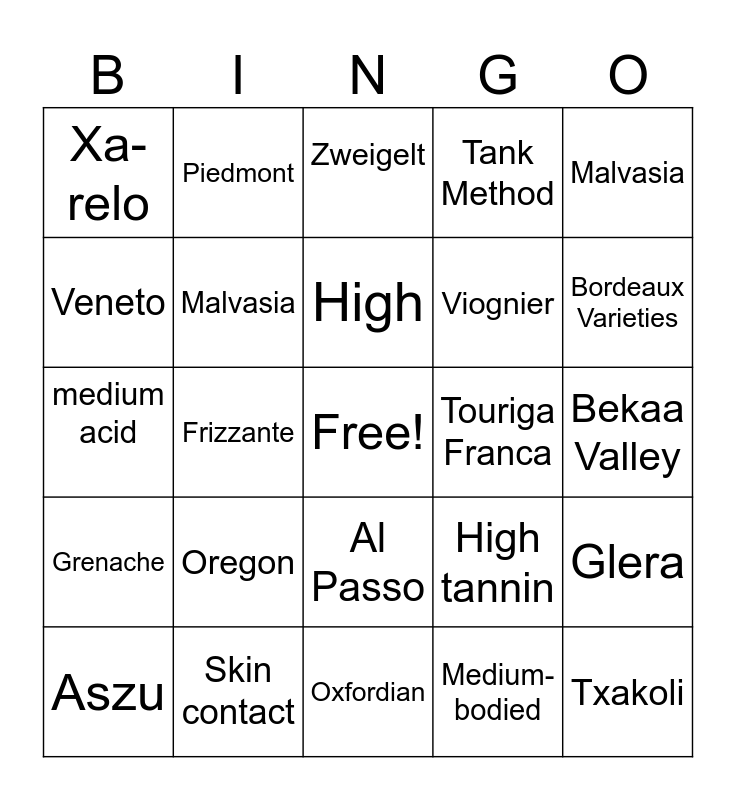 This bingo card has a free space and 24 words: Oregon, Skin contact, High, Aszu, Malvasia, Xa-relo, Veneto, Piedmont, Touriga Franca, Al Passo, Viognier, medium acid, High tannin, Glera, Malvasia, Medium-bodied, Bekaa Valley, Zweigelt, Bordeaux Varieties, Frizzante, Txakoli, Grenache, Tank Method and Oxfordian.