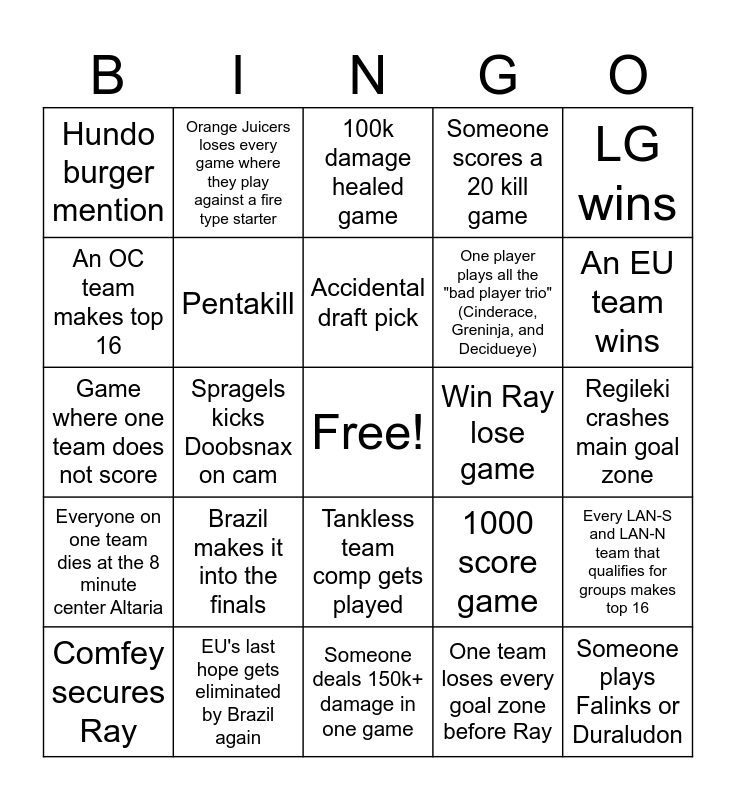This bingo card has a free space and 24 words: Brazil makes it into the finals, EU's last hope gets eliminated by Brazil again, Accidental draft pick, Comfey secures Ray, LG wins, Hundo burger mention, An OC team makes top 16, Orange Juicers loses every game where they play against a fire type starter, Win Ray lose game, Tankless team comp gets played, One player plays all the "bad player trio" (Cinderace, Greninja, and Decidueye), Game where one team does not score, 1000 score game, Every LAN-S and LAN-N team that qualifies for groups makes top 16, Pentakill, One team loses every goal zone before Ray, Regileki crashes main goal zone, 100k damage healed game, An EU team wins, Spragels kicks Doobsnax on cam, Someone plays Falinks or Duraludon, Everyone on one team dies at the 8 minute center Altaria, Someone scores a 20 kill game and Someone deals 150k+ damage in one game.