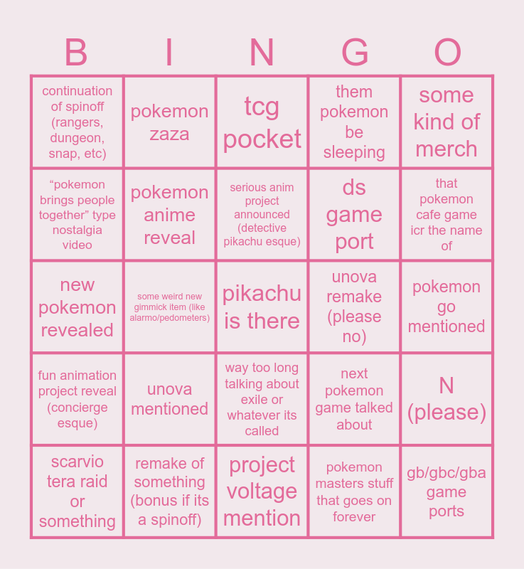 This bingo card has a free space and 24 words: unova mentioned, remake of something (bonus if its a spinoff), serious anim project announced (detective pikachu esque), scarvio tera raid or something, some kind of merch, continuation of spinoff (rangers, dungeon, snap, etc), “pokemon brings people together” type nostalgia video, pokemon zaza, unova remake (please no), way too long talking about exile or whatever its called, ds game port, new pokemon revealed, next pokemon game talked about, N (please), pokemon anime reveal, pokemon masters stuff that goes on forever, pokemon go mentioned, tcg pocket, that pokemon cafe game icr the name of, some weird new gimmick item (like alarmo/pedometers), gb/gbc/gba game ports, fun animation project reveal (concierge esque), them pokemon be sleeping and project voltage mention.