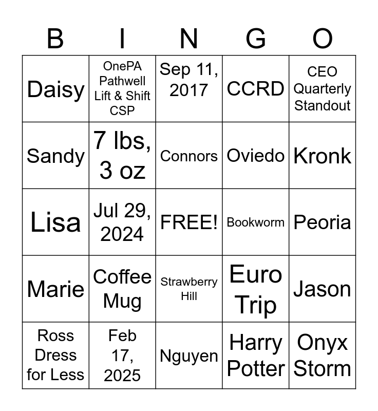 This bingo card has a free space and 31 words: Nguyen, Tatum, Jul 29, 2024, Arizona, Daisy, Sep 11, 2017, 7 lbs, 3 oz, Euro Trip, Bookworm, Harry Potter, Peoria, Onyx Storm, Oct 15, 2022, Surprise, Kronk, Seven, Jason, Coffee Mug, Marie, Strawberry Hill, CEO Quarterly Standout, Barnes & Noble, Ross Dress for Less, OnePA Pathwell Lift & Shift CSP, Oviedo, Sandy, CCRD, Lisa, Feb 17, 2025, Connors and Oct 2022.
