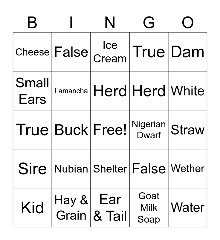 This bingo card has a free space and 29 words: Kid, Doe, Buck, Milk, Cheese, Ice Cream, Lamancha, Nubian, Nigerian Dwarf, Hay & Grain, Straw, Water, Ear & Tail, Goat Milk Soap, White, Practice, Shelter, Sire, Dam, True, False, Wether, Herd, Small Ears, True, False, Wether, Herd and Small Ears.