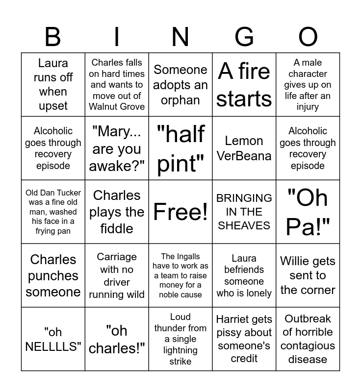 This bingo card has a free space and 24 words: Carriage with no driver running wild, "oh charles!", "half pint", "oh NELLLLS", A male character gives up on life after an injury, Laura runs off when upset, Alcoholic goes through recovery episode, Charles falls on hard times and wants to move out of Walnut Grove, BRINGING IN THE SHEAVES, The Ingalls have to work as a team to raise money for a noble cause, Lemon VerBeana, Old Dan Tucker was a fine old man, washed his face in a frying pan, Laura befriends someone who is lonely, Willie gets sent to the corner, "Mary... are you awake?", Harriet gets pissy about someone's credit, "Oh Pa!", Someone adopts an orphan, Alcoholic goes through recovery episode, Charles plays the fiddle, Outbreak of horrible contagious disease, Charles punches someone, A fire starts and Loud thunder from a single lightning strike.
