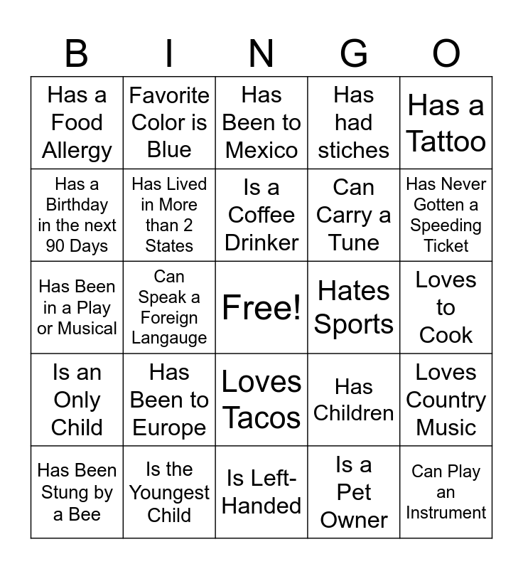 This bingo card has a free space and 24 words: Has Been to Europe, Is the Youngest Child, Is a Coffee Drinker, Has Been Stung by a Bee, Has a Tattoo, Has a Food Allergy, Has a Birthday in the next 90 Days, Favorite Color is Blue, Hates Sports, Loves Tacos, Can Carry a Tune, Has Been in a Play or Musical, Has Children, Loves Country Music, Has Lived in More than 2 States, Is a Pet Owner, Loves to Cook, Has Been to Mexico, Has Never Gotten a Speeding Ticket, Can Speak a Foreign Langauge, Can Play an Instrument, Is an Only Child, Has had stiches and Is Left-Handed.