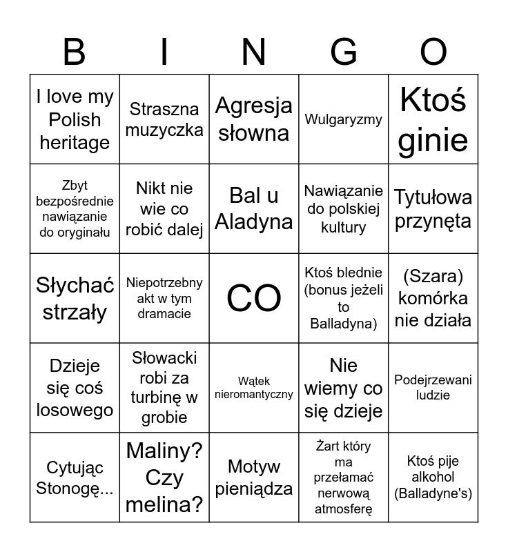 This bingo card has a free space and 24 words: Słowacki robi za turbinę w grobie, Maliny? Czy melina?, Bal u Aladyna, Cytując Stonogę..., Ktoś ginie, I love my Polish heritage, Zbyt bezpośrednie nawiązanie do oryginału, Straszna muzyczka, Ktoś blednie (bonus jeżeli to Balladyna), Wątek nieromantyczny, Nawiązanie do polskiej kultury, Słychać strzały, Nie wiemy co się dzieje, Podejrzewani ludzie, Nikt nie wie co robić dalej, Żart który ma przełamać nerwową atmosferę, (Szara) komórka nie działa, Agresja słowna, Tytułowa przynęta, Niepotrzebny akt w tym dramacie, Ktoś pije alkohol (Balladyne's), Dzieje się coś losowego, Wulgaryzmy and Motyw pieniądza.