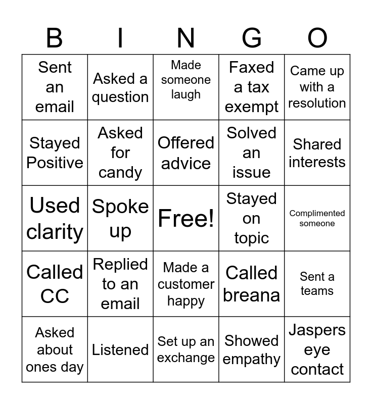 This bingo card has a free space and 24 words: Replied to an email, Listened, Offered advice, Asked about ones day, Came up with a resolution, Sent an email, Stayed Positive, Asked a question, Stayed on topic, Made a customer happy, Solved an issue, Used clarity, Called breana, Sent a teams, Asked for candy, Showed empathy, Complimented someone, Made someone laugh, Shared interests, Spoke up, Jaspers eye contact, Called CC, Faxed a tax exempt and Set up an exchange.