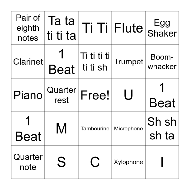 This bingo card has a free space and 29 words: Quarter note, Ta, Quarter rest, Shh, Pair of eighth notes, Ti Ti, 1 Beat, M, U, S, 1 Beat, I, C, Xylophone, Boom- whacker, Drum, Tambourine, 1 Beat, Egg Shaker, Piano, Microphone, Violin, Trumpet, Clarinet, Flute, Ta ta ti ti ta, Sh sh sh ta, Ti ti ti ti ti ti sh and Ti ti ti ti ta ta.