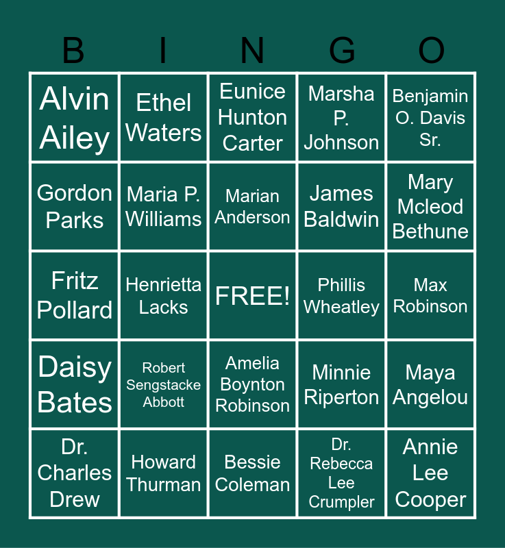 This bingo card has a free space and 48 words: Shirley Chisholm, Annie Lee Cooper, Jesse Owens, Bessie Coleman, Robert Sengstacke Abbott, Gwendolyn Brooks, Ethel Waters, Alice Coachman, Gordon Parks, Jane Bolin, Maria P. Williams, Marsha P. Johnson, Maya Angelou, Minnie Riperton, Ruby Bridges, Mae Jemison, Marian Anderson, Phillis Wheatley, Ella Baker, Benjamin O. Davis Sr., Henrietta Lacks, Dr. Rebecca Lee Crumpler, Alvin Ailey, James Baldwin, Jean-Michel Basquiat, Mary Mcleod Bethune, Dr. Charles Drew, Alice Allison Dunnigan, Amelia Boynton Robinson, Daisy Bates, Dorothy Height, Sister Rosetta Tharpe, Diane Nash, Bayard Rustin, Howard Thurman, Gil Scott-Heron, Frederick McKinley Jones, Max Robinson, Josh Gibson, Gerald Wilson, James Armistead Lafayette, Garrett Morgan, Eunice Hunton Carter, Constance Baker Motley, Fritz Pollard, Gordon Parks, Althea Gibson and Albert Murray.