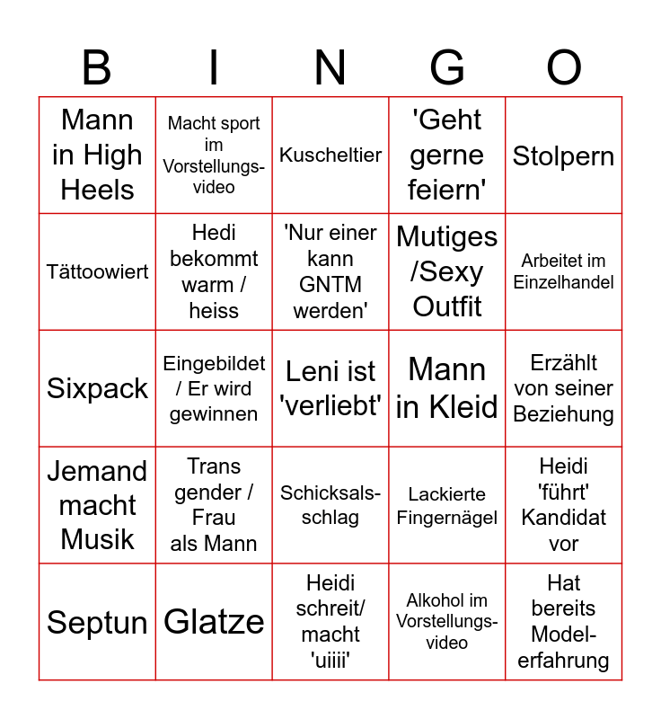 This bingo card has a free space and 24 words: Trans gender / Frau als Mann, Glatze, 'Nur einer kann GNTM werden', Septun, Stolpern, Mann in High Heels, Tättoowiert, Macht sport im Vorstellungs- video, Mann in Kleid, Schicksals- schlag, Mutiges /Sexy Outfit, Sixpack, Lackierte Fingernägel, Heidi 'führt' Kandidat vor, Hedi bekommt warm / heiss, Alkohol im Vorstellungs-video, Erzählt von seiner Beziehung, Kuscheltier, Arbeitet im Einzelhandel, Eingebildet / Er wird gewinnen, Hat bereits Model- erfahrung, Jemand macht Musik, 'Geht gerne feiern' and Heidi schreit/ macht 'uiiii'.