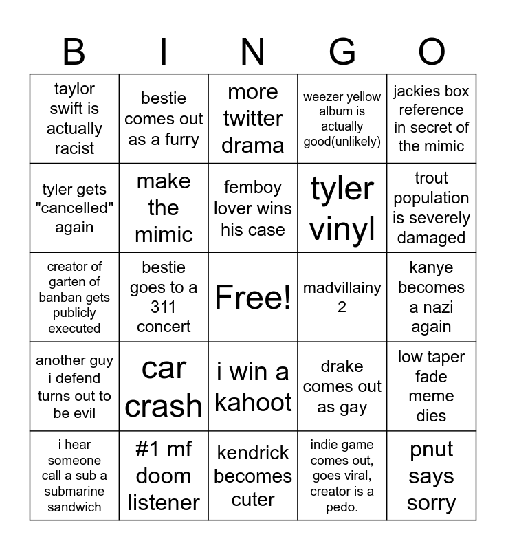 This bingo card has a free space and 24 words: car crash, #1 mf doom listener, femboy lover wins his case, i hear someone call a sub a submarine sandwich, jackies box reference in secret of the mimic, taylor swift is actually racist, tyler gets "cancelled" again, bestie comes out as a furry, madvillainy 2, i win a kahoot, tyler vinyl, creator of garten of banban gets publicly executed, drake comes out as gay, low taper fade meme dies, make the mimic, indie game comes out, goes viral, creator is a pedo., kanye becomes a nazi again, more twitter drama, trout population is severely damaged, bestie goes to a 311 concert, pnut says sorry, another guy i defend turns out to be evil, weezer yellow album is actually good(unlikely) and kendrick becomes cuter.