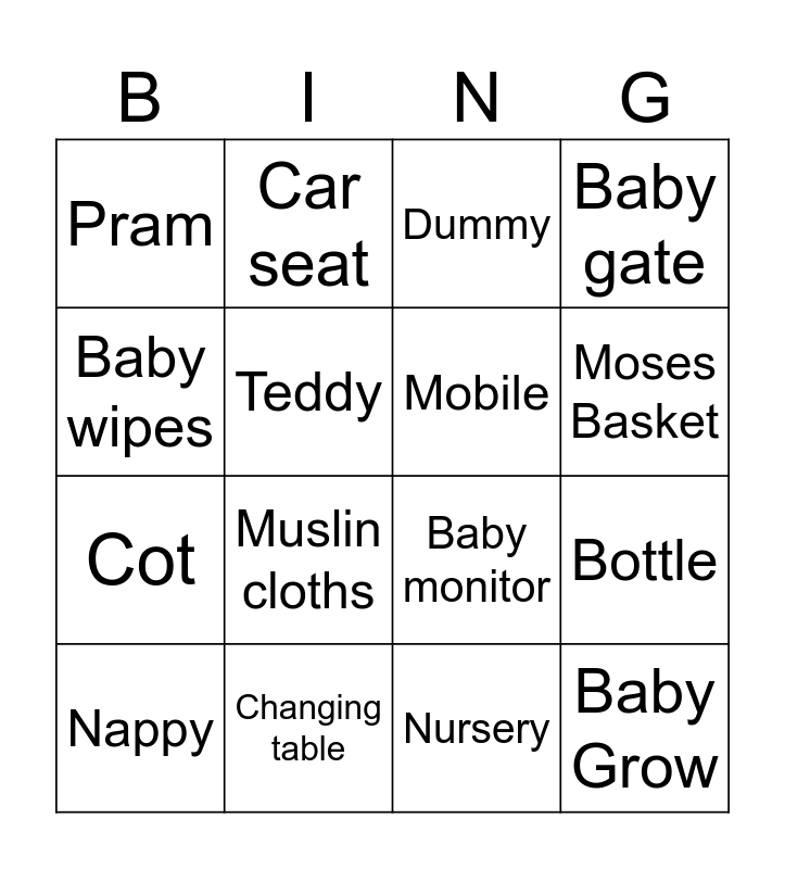 This bingo card has 20 words: Bottle, Bib, Dummy, Changing table, Nappy, Baby wipes, Changing table, Pram, Cot, Car seat, Muslin cloths, Baby monitor, Teddy, Baby Grow, Mobile, Lullabies, Moses Basket, Baby gate, Nursery and Baby lotion.