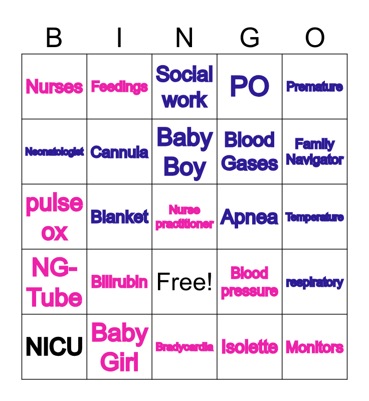 This bingo card has 26 words: Free!, Isolette, Baby Boy, Baby Girl, Premature, Nurses, Neonatologist, Feedings, Temperature, Blood pressure, Blood Gases, pulse ox, respiratory, NICU, Blanket, Bottle, PO, NG-Tube, Social work, Nurse practitioner, Family Navigator, Bradycardia, Apnea, Bilirubin, Cannula and Monitors.