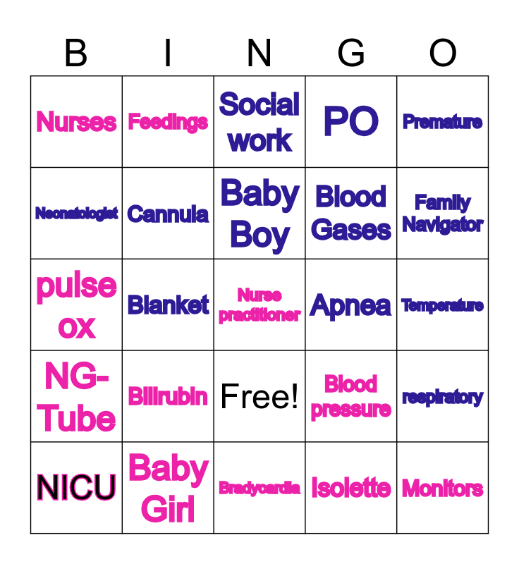 This bingo card has 26 words: Free!, Isolette, Baby Boy, Baby Girl, Premature, Nurses, Neonatologist, Feedings, Temperature, Blood pressure, Blood Gases, pulse ox, respiratory, NICU, Blanket, Bottle, PO, NG-Tube, Social work, Nurse practitioner, Family Navigator, Bradycardia, Apnea, Bilirubin, Cannula and Monitors.