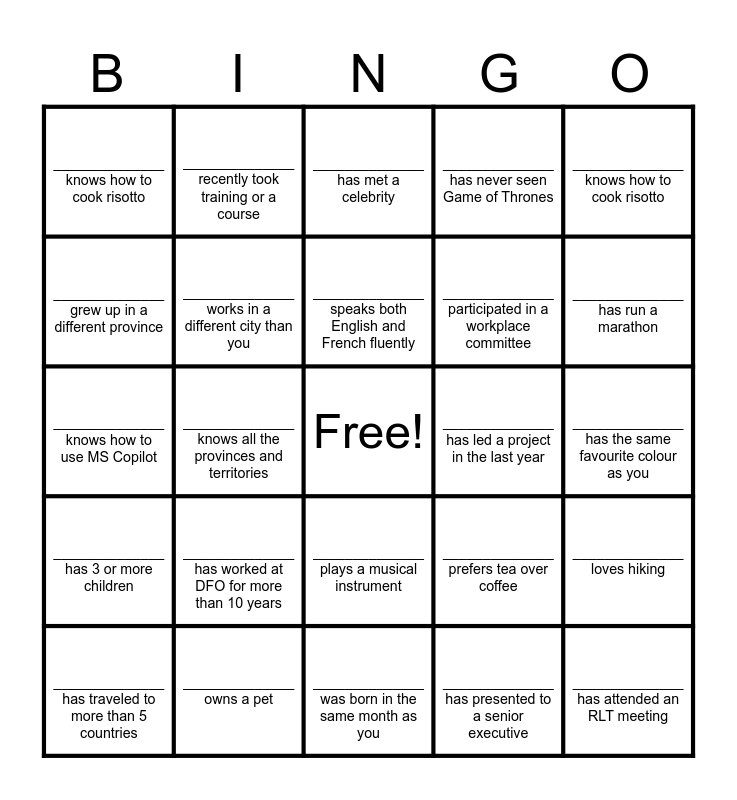 This bingo card has a free space and 24 words: ______________ has worked at DFO for more than 10 years, ______________ owns a pet, ______________ speaks both English and French fluently, ______________ has traveled to more than 5 countries, ______________ knows how to cook risotto, ______________ knows how to cook risotto, ______________ grew up in a different province, ______________ recently took training or a course, ______________ has led a project in the last year, ______________ plays a musical instrument, ______________ participated in a workplace committee, ______________ knows how to use MS Copilot, ______________ prefers tea over coffee, ______________ loves hiking, ______________ works in a different city than you, ______________ has presented to a senior executive, ______________ has the same favourite colour as you, ______________ has met a celebrity, ______________ has run a marathon, ______________ knows all the provinces and territories, ______________ has attended an RLT meeting, ______________ has 3 or more children, ______________ has never seen Game of Thrones and ______________ was born in the same month as you.