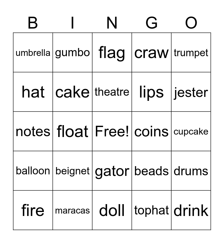 This bingo card has a free space and 35 words: mask, fleur, crown, cake, gator, craw, hat, sax, theatre, la, notes, trumpet, mardi, feathers, umbrella, coins, tophat, float, balloon, drink, beads, fire, drums, maracas, flag, jester, stars, rainbow, lips, cupcake, banner, doll, beignet, gumbo and po.