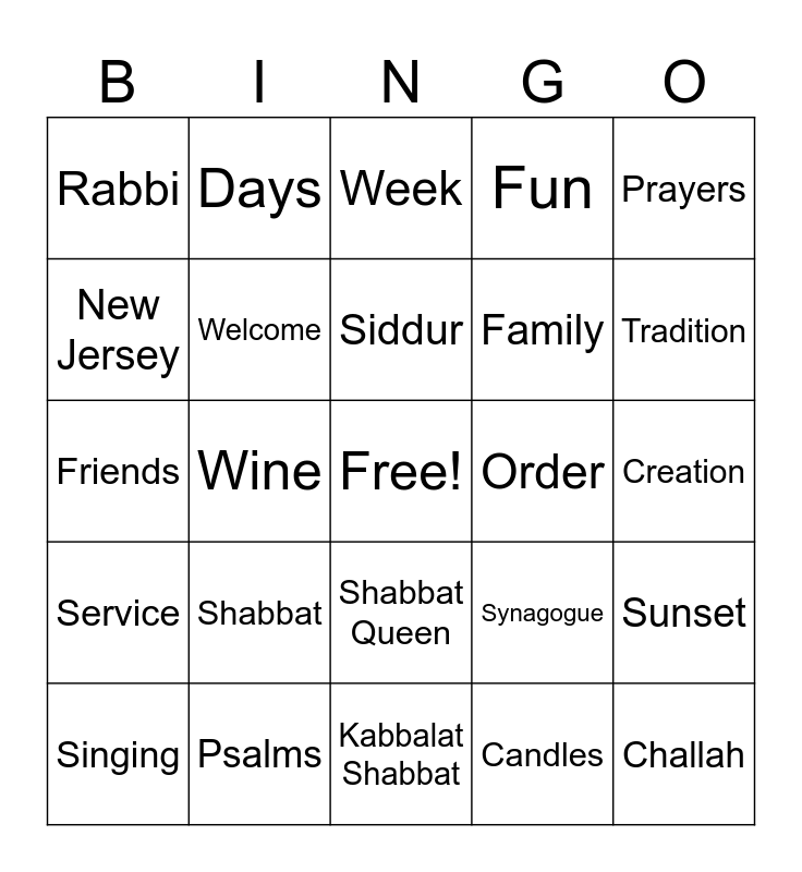 This bingo card has a free space and 24 words: Shabbat, Psalms, Siddur, Singing, Prayers, Rabbi, New Jersey, Days, Order, Shabbat Queen, Family, Friends, Synagogue, Sunset, Welcome, Candles, Creation, Week, Tradition, Wine, Challah, Service, Fun and Kabbalat Shabbat.