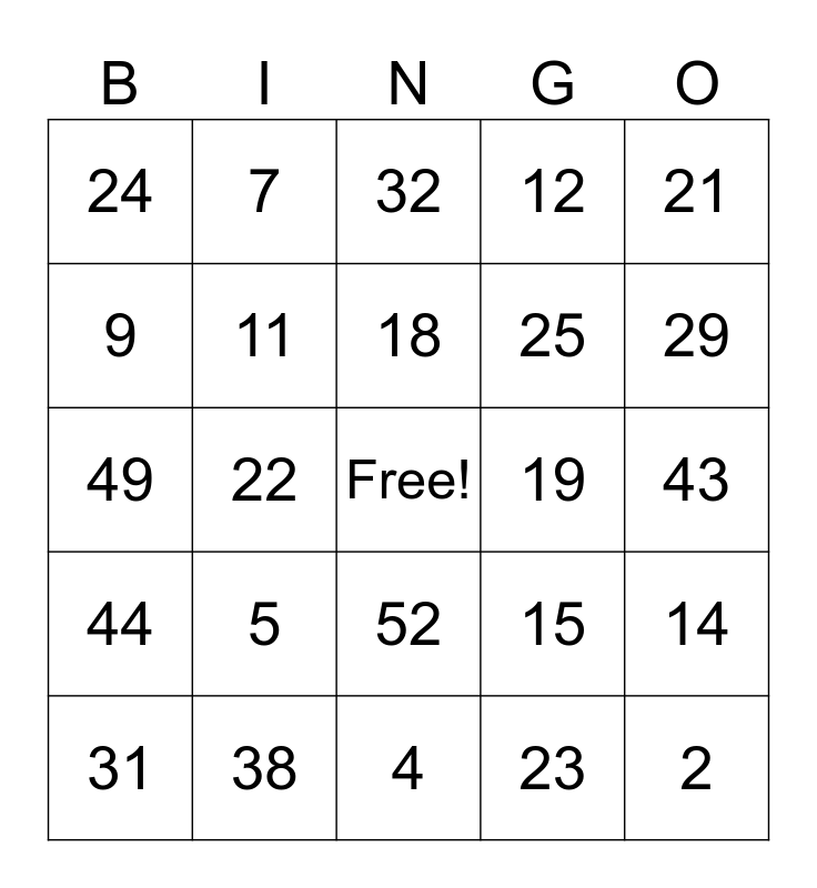 This bingo card has a free space and 51 words: 1, 2, 3, 4, 5, 6, 7, 8, 9, 10, 11, 12, 14, 15, 16, 17, 18, 19, 20, 21, 22, 23, 24, 25, 27, 28, 29, 30, 31, 32, 33, 34, 35, 36, 37, 38, 39, 40, 41, 42, 43, 44, 45, 46, 47, 48, 49, 50, 51, 52 and 53.