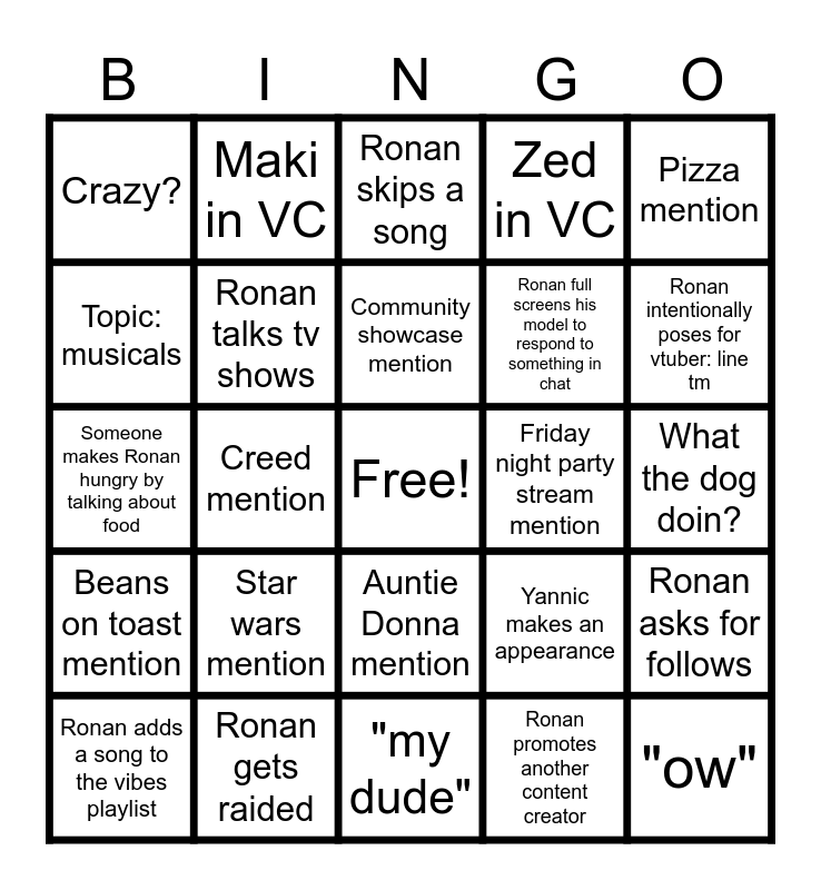 This bingo card has a free space and 29 words: Ronan adds a song to the vibes playlist, Ronan exaggerates or fakes a British accent for comedy, Creed mention, Freckles cam, Crazy?, Ronan skips a song, Ronan talks tv shows, Star wars mention, Friday night party stream mention, Ronan gets raided, What the dog doin?, "ow", "my dude", Ronan promotes another content creator, Ronan intentionally poses for vtuber: line tm, "lexer coded", Auntie Donna mention, Beans on toast mention, Pizza mention, Someone makes Ronan hungry by talking about food, Yannic makes an appearance, Ronan feeds freckles on cam, Ronan full screens his model to respond to something in chat, Topic: musicals, Zed in VC, Maki in VC, Ronan asks for follows, Community showcase mention and Ronan hums along to a song.