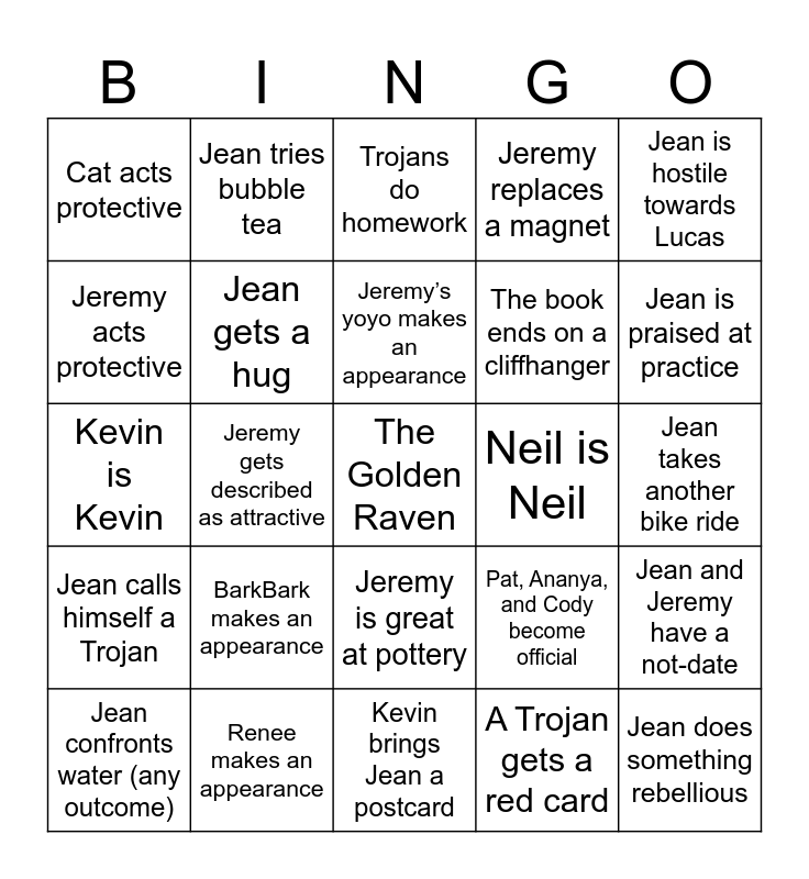 This bingo card has a free space and 24 words: BarkBark makes an appearance, Renee makes an appearance, Jeremy’s yoyo makes an appearance, Jean confronts water (any outcome), Jean is hostile towards Lucas, Cat acts protective, Jeremy acts protective, Jean tries bubble tea, Neil is Neil, Jeremy is great at pottery, The book ends on a cliffhanger, Kevin is Kevin, Pat, Ananya, and Cody become official, Jean and Jeremy have a not-date, Jean gets a hug, A Trojan gets a red card, Jean takes another bike ride, Trojans do homework, Jean is praised at practice, Jeremy gets described as attractive, Jean does something rebellious, Jean calls himself a Trojan, Jeremy replaces a magnet and Kevin brings Jean a postcard.