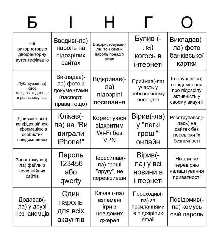 This bingo card has a free space and 24 words: Пароль 123456 або qwerty, Один пароль для всіх акаунтів, Відкривав(-ла) підозрілі посилання, Додавав(-ла) у друзі незнайомців, Викладав(-ла) фото банківської картки, Не використовую двофакторну аутентифікацію, Публікував(-ла) своє місцезнаходження в реальному часі, Вводив(-ла) пароль на підозрілих сайтах, Вірив(-ла) у "легкі гроші" онлайн, Пересилав(-ла) гроші "другу", не перевіривши, Приймав(-ла) участь у небезпечному челенджі, Ділився(-лась) конфіденційною інформацією в особистих повідомленнях, Вірив(-ла) у всі новини в інтернеті, Ніколи не перевіряю налаштування приватності, Викладав(-ла) фото з документами (паспорт, права тощо), Переходив(-ла) за посиланнями в підозрілих email, Реєструвався(-лась) на сайтах без перевірки їх безпечності, Використовував(-ла) той самий пароль понад 5 років, Ігнорував(-ла) повідомлення про підозрілу активність у своєму акаунті, Клікав(-ла) на "Ви виграли iPhone!", Повідомив(-ла) комусь свій пароль, Завантажував(-ла) файли з неофіційних сайтів, Булив (-ла) когось в інтернеті and Качав (-ла) взламані ігри з невідомих джерел.