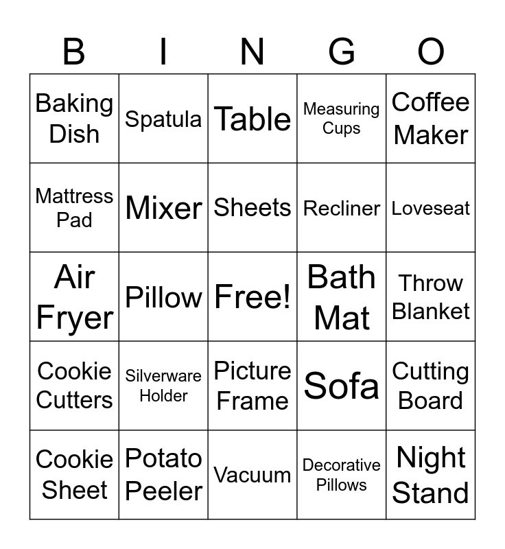 This bingo card has a free space and 75 words: Bed, Chair, Table, Lamp, Plates, Bowls, Forks, Spoons, Salt & Pepper Shakers, Water Glasses, Juice Glasses, Coffee Cups, Sheets, Mattress Pad, Towel, Pillow, Comforter, Night Stand, End Table, Coffee Maker, Toaster, Air Fryer, Mixer, Spatula, Measuring Cups, Measuring Spoons, Table Cloth, Hangers, Trash Can, TV, Dresser, Desk, Desk Chair, Sofa, Loveseat, Recliner, Ottoman, Shower Curtain, Throw Blanket, Decorative Pillows, Vase, Statue, Tray, Basket, Skillet, Pots & Pans, Cookie Sheet, Baking Dish, Book Shelf, Mirror, Art, Picture Frame, Coffee Table, Microwave Stand, Clock, Knives, Tools, Extension Cord, Pitcher, Kitchen Towel, Silverware Holder, Potholder, Kitchen Canisters, Food Storage Containers, Laundry Bag, Bath Mat, Paper Towels, Apron, Pizza Cutter, Cutting Board, Cookie Cutters, Potato Peeler, Coasters, Vacuum and Mop.
