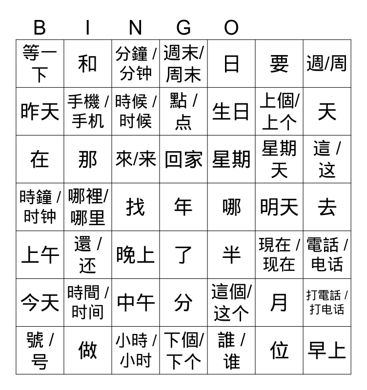 This bingo card has a free space and 48 words: 這個/ 这个, 上個/ 上个, 下個/ 下个, 哪裡/ 哪里, 來/来, 去, 和, 做, 要, 了, 週/周, 週末/ 周末, 星期天, 星期, 今天, 明天, 昨天, 天, 月, 日, 生日, 找, 等一下, 手機 / 手机, 打電話 / 打电话, 時候 / 时候, 這 / 这, 號 / 号, 回家, 那, 位, 哪, 電話 / 电话, 時間 / 时间, 時鐘 / 时钟, 半, 現在 / 现在, 在, 晚上, 中午, 上午, 早上, 分鐘 / 分钟, 小時 / 小时, 點 / 点, 分, 還 / 还 and 誰 / 谁.