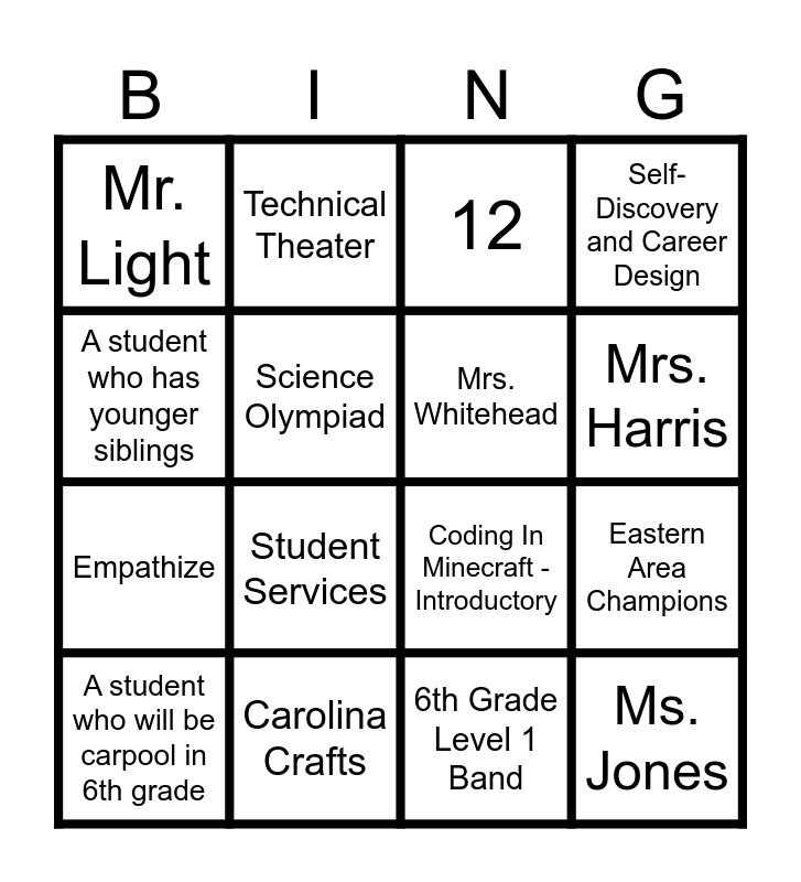 This bingo card has 27 words: Free!, A student who goes to a different elementary school, Empathize, Robotics, Science Olympiad, 12, Technical Theater, Ms. Jones, Carolina Crafts, Exploratory Language, Coding In Minecraft - Introductory, Self-Discovery and Career Design, PowerSchool, PRIDE stamp, Student Services, Homeroom, Mrs. Whitehead, Mrs. Harris, Agricultural Science, Mr. Light, 6th Grade Level 1 Band, 6th Grade Level 1 Orchestra, Eastern Area Champions, A student who will be carpool in 6th grade, A student who will ride the bus in 6th grade, A student who has younger siblings and A student who has older siblings.