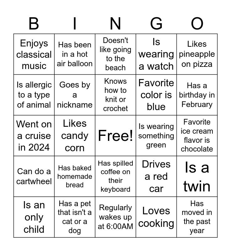 This bingo card has a free space and 24 words: Has baked homemade bread, Has a pet that isn't a cat or a dog, Knows how to knit or crochet, Is an only child, Likes pineapple on pizza, Enjoys classical music, Is allergic to a type of animal, Has been in a hot air balloon, Is wearing something green, Has spilled coffee on their keyboard, Favorite color is blue, Went on a cruise in 2024, Drives a red car, Is a twin, Goes by a nickname, Loves cooking, Favorite ice cream flavor is chocolate, Doesn't like going to the beach, Has a birthday in February, Likes candy corn, Has moved in the past year, Can do a cartwheel, Is wearing a watch and Regularly wakes up at 6:00AM.