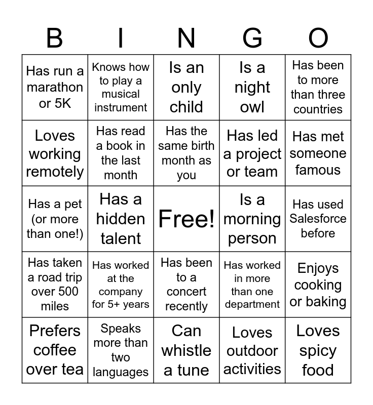 This bingo card has a free space and 24 words: Has worked at the company for 5+ years, Speaks more than two languages, Has the same birth month as you, Prefers coffee over tea, Has been to more than three countries, Has run a marathon or 5K, Loves working remotely, Knows how to play a musical instrument, Is a morning person, Has been to a concert recently, Has led a project or team, Has a pet (or more than one!), Has worked in more than one department, Enjoys cooking or baking, Has read a book in the last month, Loves outdoor activities, Has used Salesforce before, Is an only child, Has met someone famous, Has a hidden talent, Loves spicy food, Has taken a road trip over 500 miles, Is a night owl and Can whistle a tune.