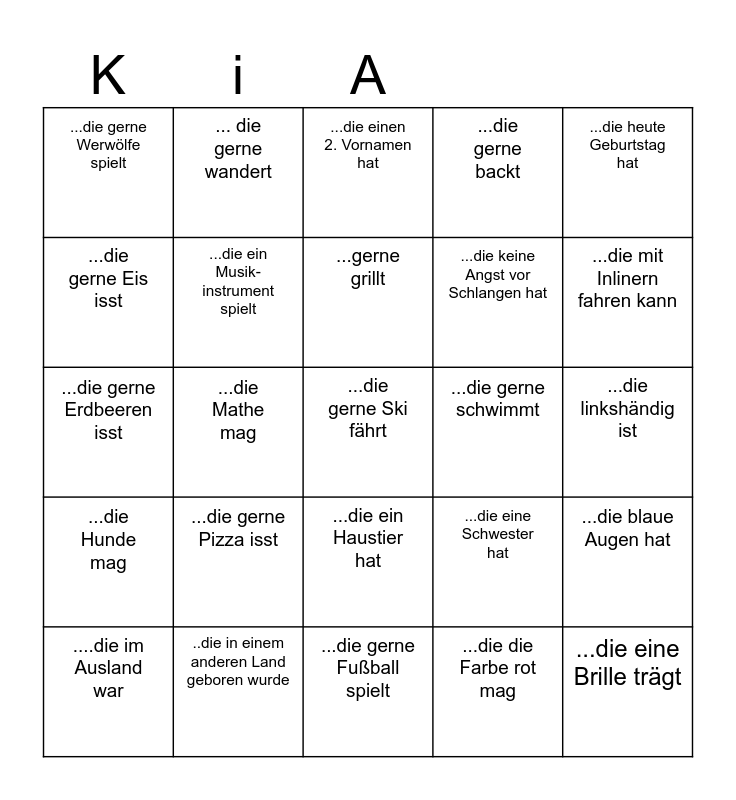 This bingo card has 25 words: ...die gerne Pizza isst, ...die gerne Fußball spielt, ...gerne grillt, ....die im Ausland war, ...die heute Geburtstag hat, ...die gerne Werwölfe spielt, ...die gerne Eis isst, ... die gerne wandert, ...die gerne schwimmt, ...die ein Haustier hat, ...die keine Angst vor Schlangen hat, ...die gerne Erdbeeren isst, ...die eine Schwester hat, ...die blaue Augen hat, ...die ein Musik- instrument spielt, ...die eine Brille trägt, ...die linkshändig ist, ...die einen 2. Vornamen hat, ...die mit Inlinern fahren kann, ...die Mathe mag, ...die gerne Ski fährt, ..die in einem anderen Land geboren wurde, ...die Hunde mag, ...die gerne backt and ...die die Farbe rot mag.