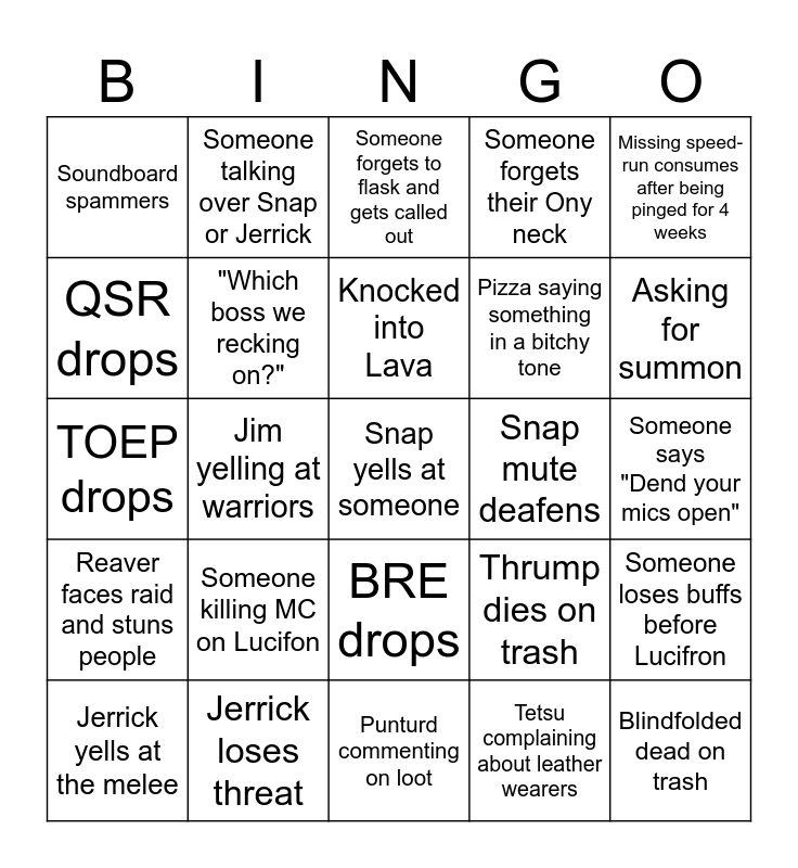 This bingo card has a free space and 29 words: Jerrick yells at the melee, Accidental trash pull, Jim yelling at warriors, Rahn complaining about groups, Soundboard spammers, Someone forgets to flask and gets called out, "Which boss we recking on?", Someone killing MC on Lucifon, Snap mute deafens, Jerrick loses threat, Someone says "Dend your mics open", Blindfolded dead on trash, Punturd commenting on loot, Tetsu complaining about leather wearers, Asking for summon, Krunks dead on trash, BRE drops, Reaver faces raid and stuns people, Missing speed-run consumes after being pinged for 4 weeks, TOEP drops, Thrump dies on trash, Complaining about raid comp, Pizza saying something in a bitchy tone, QSR drops, Someone forgets their Ony neck, Someone talking over Snap or Jerrick, Someone loses buffs before Lucifron, Knocked into Lava and French Canadian jokes.