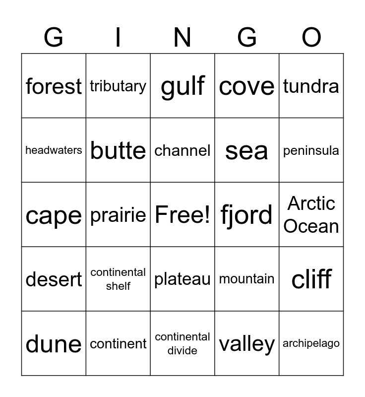 This bingo card has a free space and 49 words: atoll, archipelago, pond, continental divide, continental shelf, mouth river, tributary, stream, headwaters, cave, butte, cove, cliff, mountain, plain, beach, channel, fjord, glacier, tundra, prairie, valley, forest, sea, strait, peninsula, dune, hill, plateau, desert, island, ocean, delta, landform, continent, Pacific Ocean, Atlantic Ocean, Southern Ocean, Arctic Ocean, Equator, Prime Meridian, political, physical, volcano, cape, gulf, bay, canyon and geyser.