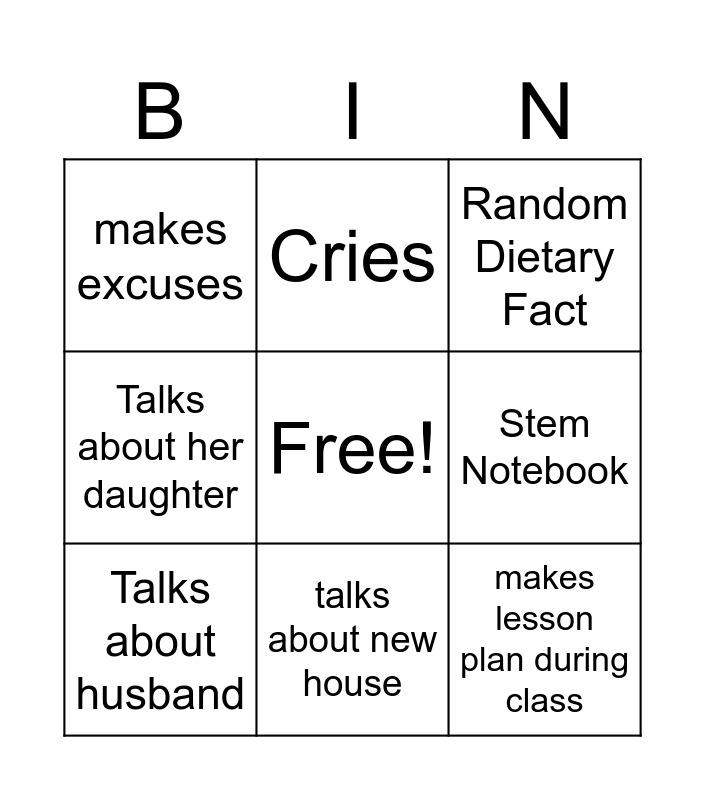 This bingo card has a free space and 8 words: Stem Notebook, Random Dietary Fact, Cries, Talks about husband, makes excuses, makes lesson plan during class, Talks about her daughter and talks about new house.