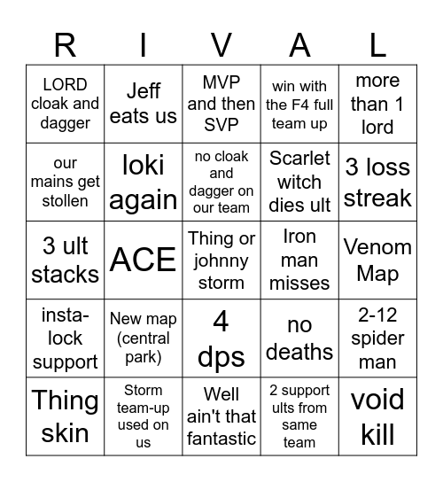 This bingo card has a free space and 24 words: New map (central park), Storm team-up used on us, no cloak and dagger on our team, Thing skin, more than 1 lord, LORD cloak and dagger, our mains get stollen, Jeff eats us, Iron man misses, 4 dps, Scarlet witch dies ult, 3 ult stacks, no deaths, 2-12 spider man, loki again, 2 support ults from same team, Venom Map, MVP and then SVP, 3 loss streak, ACE, void kill, insta-lock support, win with the F4 full team up and Well ain't that fantastic.