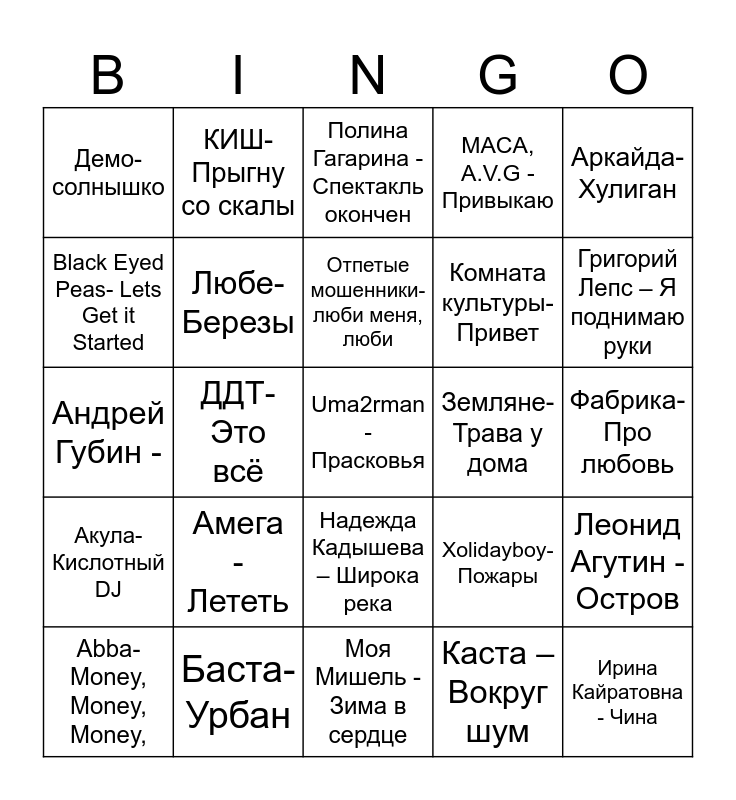 This bingo card has 25 words: Амега - Лететь, Моя Мишель - Зима в сердце, Отпетые мошенники- люби меня, люби, Аbba- Money, Money, Money,, Аркайда- Хулиган, Демо- солнышко, Black Eyed Peas- Lets Get it Started, КИШ- Прыгну со скалы, Земляне- Трава у дома, Надежда Кадышева – Широка река, Комната культуры- Привет, Андрей Губин -, Xolidayboy- Пожары, Леонид Агутин - Остров, Любе- Березы, Ирина Кайратовна - Чина, Фабрика- Про любовь, Полина Гагарина - Спектакль окончен, Григорий Лепс – Я поднимаю руки, ДДТ- Это всё, Uma2rman - Прасковья, Баста- Урбан, Акула- Кислотный DJ, MACA, A.V.G - Привыкаю and Каста – Вокруг шум.
