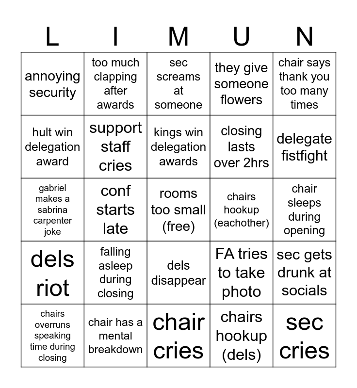 This bingo card has a free space and 31 words: chair cries, delegate cries, conf starts late, rooms get swapped, annoying security, sec screams at someone, support staff cries, FA tries to take photo, chairs hookup (eachother), chairs hookup (dels), chair sleeps during opening, sec cries, chairs are late/hungover, chair says no tech, delegate fistfight, chairs bunk off, sec gets drunk at socials, falling asleep during closing, dels riot, dels disappear, chair says thank you too many times, sec says thank you too many times, chairs overruns speaking time during closing, too much clapping after awards, closing lasts over 2hrs, hult win delegation award, they give someone flowers, gabriel makes a sabrina carpenter joke, chair has a mental breakdown, kings win delegation awards and previous sec members forget they're not sec anymore.