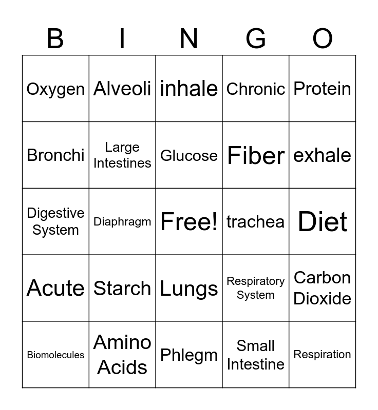 This bingo card has a free space and 24 words: Starch, Amino Acids, Glucose, Biomolecules, Protein, Oxygen, Bronchi, Alveoli, trachea, Lungs, Fiber, Digestive System, Respiratory System, Carbon Dioxide, Large Intestines, Small Intestine, Diet, inhale, exhale, Diaphragm, Respiration, Acute, Chronic and Phlegm.