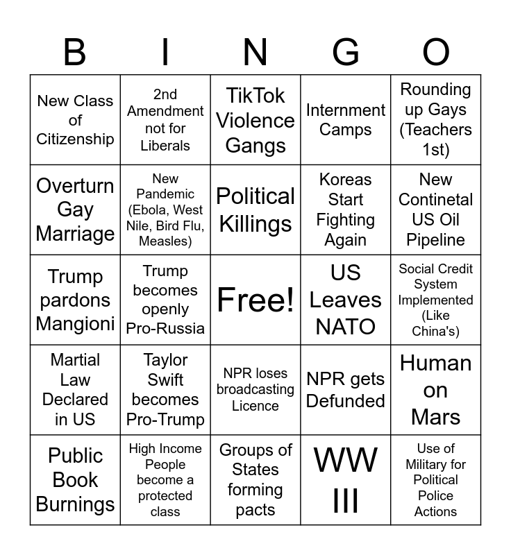 This bingo card has a free space and 34 words: Bird Flu Kills Human, WW III, Biological Warfare on Humans, China Invades Taiwan, Martial Law Declared in US, New Pandemic (Ebola, West Nile, Bird Flu, Measles), Rounding up Gays (Teachers 1st), Public Book Burnings, 2nd Amendment not for Liberals, 3rd Term for Trump Proposal, Political Killings, TikTok Violence Gangs, Loyalty Oath for Public Services(DrIvers Livence, Passport, etc), Arrests of Sitting opposition Politicians, US Leaves NATO, New Continetal US Oil Pipeline, High Income People become a protected class, Trump pardons Mangioni, Taylor Swift becomes Pro-Trump, NPR gets Defunded, NPR loses broadcasting Licence, Unnecessary Military Deployments (Panama, Greenland, Gaza), New Class of Citizenship, Social Credit System Implemented (Like China's), Groups of States forming pacts, Use of Military for Political Police Actions, Internment Camps, Codified Loss of Women's Rights, Koreas Start Fighting Again, Overturn Gay Marriage, Russia pushes further into Ukraine, Trump becomes openly Pro-Russia, Human on Mars and Elon has another kid.