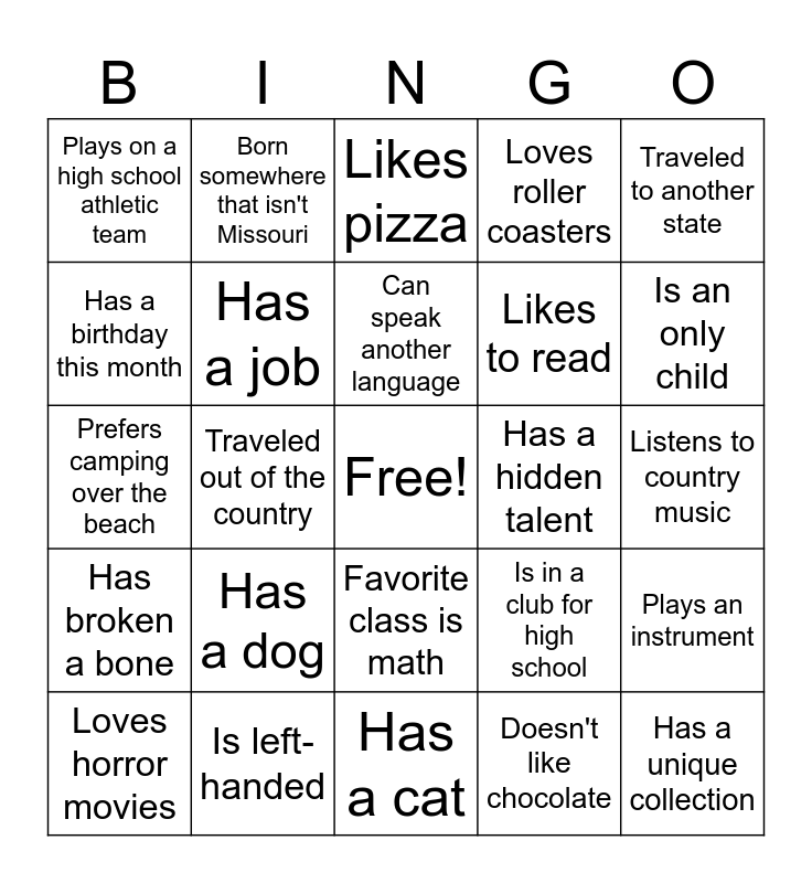 This bingo card has a free space and 24 words: Has a dog, Is left-handed, Can speak another language, Loves horror movies, Traveled to another state, Plays on a high school athletic team, Has a birthday this month, Born somewhere that isn't Missouri, Has a hidden talent, Favorite class is math, Likes to read, Prefers camping over the beach, Is in a club for high school, Plays an instrument, Has a job, Doesn't like chocolate, Listens to country music, Likes pizza, Is an only child, Traveled out of the country, Has a unique collection, Has broken a bone, Loves roller coasters and Has a cat.
