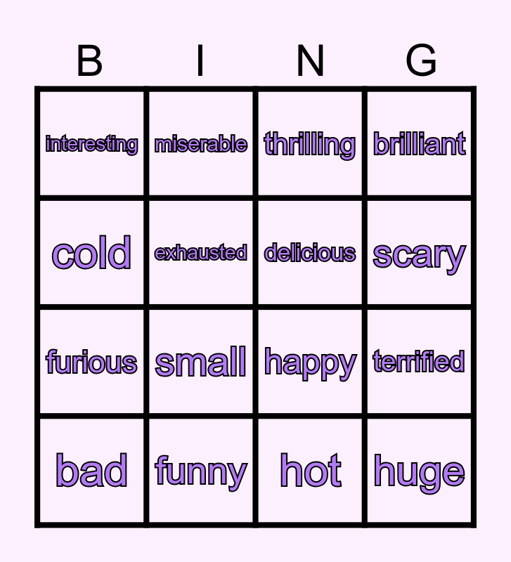 This bingo card has 16 words: funny, terrified, thrilling, interesting, furious, miserable, happy, hot, cold, exhausted, bad, brilliant, small, scary, delicious and huge.