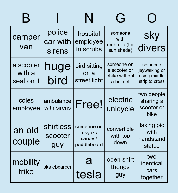 This bingo card has a free space and 24 words: shirtless scooter guy, skateboarder, bird sitting on a street light, mobility trike, sky divers, camper van, a scooter with a seat on it, police car with sirens, electric unicycle, someone on a kyak / canoe / paddleboard, someone on a scooter or ebike without a helmet, coles employee, convertible with top down, taking pic with handstand statue, huge bird, open shirt thongs guy, two people sharing a scooter or bike, hospital employee in scrubs, someone jaywalking or using middle strip to cross, ambulance with sirens, two identical cars together, an old couple, someone with umbrella (for sun shade) and a tesla.