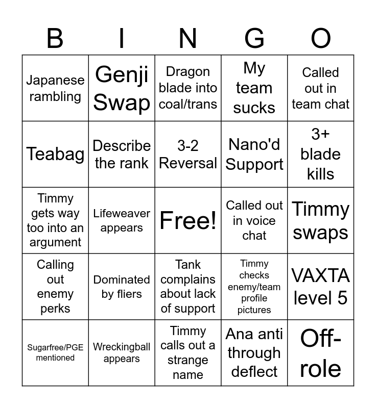 This bingo card has a free space and 24 words: Dominated by fliers, Wreckingball appears, 3-2 Reversal, Sugarfree/PGE mentioned, Called out in team chat, Japanese rambling, Teabag, Genji Swap, Called out in voice chat, Tank complains about lack of support, Nano'd Support, Timmy gets way too into an argument, Timmy checks enemy/team profile pictures, VAXTA level 5, Describe the rank, Ana anti through deflect, Timmy swaps, Dragon blade into coal/trans, 3+ blade kills, Lifeweaver appears, Off-role, Calling out enemy perks, My team sucks and Timmy calls out a strange name.