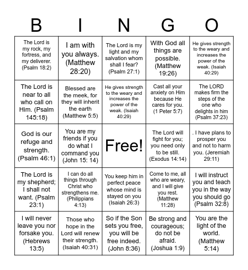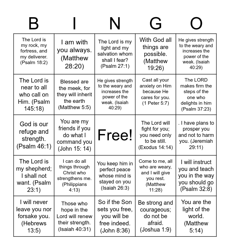 This bingo card has a free space and 24 words: I can do all things through Christ who strengthens me. (Philippians 4:13), Those who hope in the Lord will renew their strength. (Isaiah 40:31), He gives strength to the weary and increases the power of the weak. (Isaiah 40:29), I will never leave you nor forsake you. (Hebrews 13:5), He gives strength to the weary and increases the power of the weak. (Isaiah 40:29), The Lord is my rock, my fortress, and my deliverer. (Psalm 18:2), The Lord is near to all who call on Him. (Psalm 145:18), I am with you always. (Matthew 28:20), The Lord will fight for you; you need only to be still. (Exodus 14:14), You keep him in perfect peace whose mind is stayed on you (Isaiah 26:3), Cast all your anxiety on Him because He cares for you. (1 Peter 5:7), God is our refuge and strength. (Psalm 46:1), Come to me, all who are weary, and I will give you rest. (Matthew 11:28), I will instruct you and teach you in the way you should go (Psalm 32:8), Blessed are the meek, for they will inherit the earth (Matthew 5:5), Be strong and courageous; do not be afraid. (Joshua 1:9), . I have plans to prosper you and not to harm you. (Jeremiah 29:11), The Lord is my light and my salvation whom shall I fear? (Psalm 27:1), The LORD makes firm the steps of the one who delights in him (Psalm 37:23), You are my friends if you do what I command you (John 15: 14), You are the light of the world. (Matthew 5:14), The Lord is my shepherd; I shall not want. (Psalm 23:1), With God all things are possible. (Matthew 19:26) and So if the Son sets you free, you will be free indeed. (John 8:36).