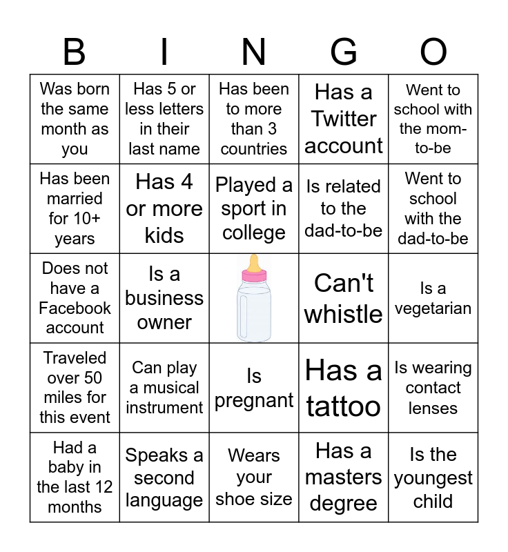 This bingo card has a free space and 24 words: Had a baby in the last 12 months, Can play a musical instrument, Played a sport in college, Has a masters degree, Went to school with the mom-to-be, Was born the same month as you, Has 5 or less letters in their last name, Has been to more than 3 countries, Can't whistle, Is a vegetarian, Does not have a Facebook account, Has 4 or more kids, Has a tattoo, Is wearing contact lenses, Has been married for 10+ years, Speaks a second language, Wears your shoe size, Has a Twitter account, Went to school with the dad-to-be, Traveled over 50 miles for this event, Is a business owner, Is pregnant, Is related to the dad-to-be and Is the youngest child.