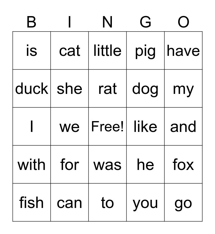 This bingo card has a free space and 30 words: can, the, we, see, is, little, she, was, like, to, and, go, you, do, my, are, he, with, for, have, I, a, cat, dog, duck, pig, fox, fish, rat and hen.