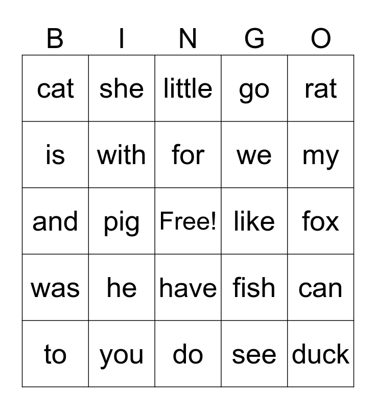 This bingo card has a free space and 28 words: can, the, we, see, is, little, she, was, like, to, and, go, you, do, my, are, he, with, for, have, cat, dog, duck, pig, fox, fish, rat and hen.