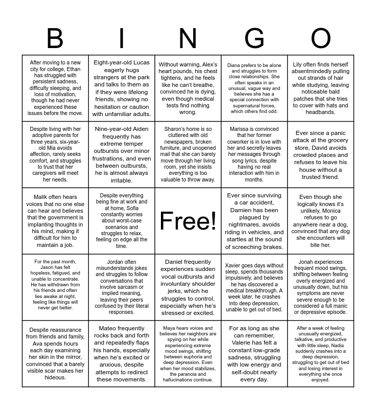 This bingo card has a free space and 24 words: Jordan often misunderstands jokes and struggles to follow conversations that involve sarcasm or implied meaning, leaving their peers confused by their literal responses., Mateo frequently rocks back and forth and repeatedly flaps his hands, especially when he’s excited or anxious, despite attempts to redirect these movements., Sharon’s home is so cluttered with old newspapers, broken furniture, and unopened mail that she can barely move through her living room, yet she insists everything is too valuable to throw away., Despite reassurance from friends and family, Ava spends hours each day examining her skin in the mirror, convinced that a barely visible scar makes her hideous., Lily often finds herself absentmindedly pulling out strands of hair while studying, leaving noticeable bald patches that she tries to cover with hats and headbands., After moving to a new city for college, Ethan has struggled with persistent sadness, difficulty sleeping, and loss of motivation, though he had never experienced these issues before the move., Despite living with her adoptive parents for three years, six-year-old Mia avoids affection, rarely seeks comfort, and struggles to trust that her caregivers will meet her needs., Eight-year-old Lucas eagerly hugs strangers at the park and talks to them as if they were lifelong friends, showing no hesitation or caution with unfamiliar adults., Ever since surviving a car accident, Damien has been plagued by nightmares, avoids riding in vehicles, and startles at the sound of screeching brakes., Daniel frequently experiences sudden vocal outbursts and involuntary shoulder jerks, which he struggles to control, especially when he’s stressed or excited., Marissa is convinced that her former coworker is in love with her and secretly leaves her messages through song lyrics, despite having no real interaction with him in months., Malik often hears voices that no one else can hear and believes that the government is implanting thoughts in his mind, making it difficult for him to maintain a job., Xavier goes days without sleep, spends thousands impulsively, and believes he has discovered a medical breakthrough. A week later, he crashes into deep depression, unable to get out of bed., Jonah experiences frequent mood swings, shifting between feeling overly energized and unusually down, but his symptoms are never severe enough to be considered a full manic or depressive episode., Nine-year-old Aiden frequently has extreme temper outbursts over minor frustrations, and even between outbursts, he is almost always irritable., For as long as she can remember, Valerie has felt a constant low-grade sadness, struggling with low energy and self-doubt nearly every day., Even though she logically knows it’s unlikely, Monica refuses to go anywhere near a dog, convinced that any dog she encounters will bite her., Without warning, Alex’s heart pounds, his chest tightens, and he feels like he can’t breathe, convinced he is dying, even though medical tests find nothing wrong., Ever since a panic attack at the grocery store, David avoids crowded places and refuses to leave his house without a trusted friend., Despite everything being fine at work and at home, Sofia constantly worries about worst-case scenarios and struggles to relax, feeling on edge all the time., After a week of feeling unusually energized, talkative, and productive with little sleep, Nadia suddenly crashes into a deep depression, struggling to get out of bed and losing interest in everything she once enjoyed., For the past month, Jason has felt hopeless, fatigued, and unable to concentrate. He has withdrawn from his friends and often lies awake at night, feeling like things will never get better., Diana prefers to be alone and struggles to form close relationships. She often speaks in an unusual, vague way and believes she has a special connection with supernatural forces, which others find odd. and Maya hears voices and believes her neighbors are spying on her while experiencing extreme mood swings, shifting between euphoria and deep depression. Even when her mood stabilizes, the paranoia and hallucinations continue..