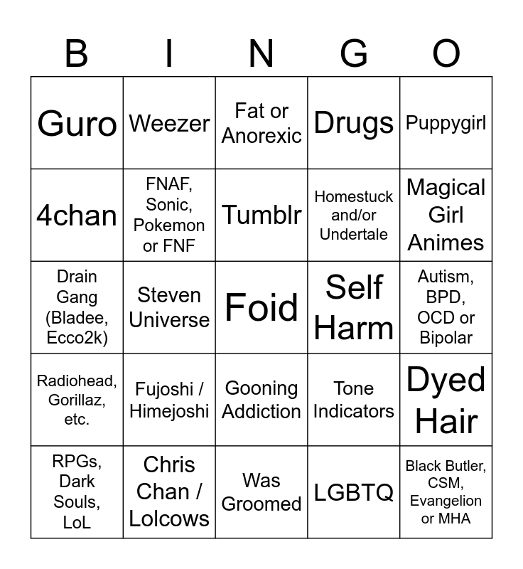 This bingo card has a free space and 24 words: Fujoshi / Himejoshi, Chris Chan / Lolcows, Tumblr, RPGs, Dark Souls, LoL, Puppygirl, Guro, 4chan, Weezer, Self Harm, Gooning Addiction, Homestuck and/or Undertale, Drain Gang (Bladee, Ecco2k), Tone Indicators, Dyed Hair, FNAF, Sonic, Pokemon or FNF, LGBTQ, Autism, BPD, OCD or Bipolar, Fat or Anorexic, Magical Girl Animes, Steven Universe, Black Butler, CSM, Evangelion or MHA, Radiohead, Gorillaz, etc., Drugs and Was Groomed.