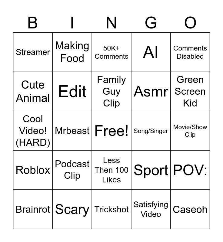 This bingo card has a free space and 24 words: Brainrot, Podcast Clip, Family Guy Clip, Satisfying Video, Comments Disabled, Streamer, Making Food, 50K+ Comments, Song/Singer, Movie/Show Clip, Cool Video! (HARD), Edit, Sport, POV:, Cute Animal, Scary, Trickshot, AI, Green Screen Kid, Roblox, Mrbeast, Less Then 100 Likes, Asmr and Caseoh.