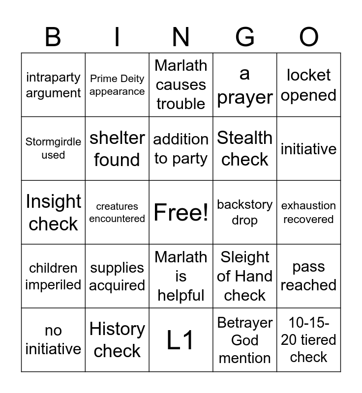 This bingo card has a free space and 37 words: friendly NPC death, new NPC introduced, run out of cheese, shelter found, pass reached, supplies acquired, addition to party, Roach found, locket opened, Betrayer God followers encountered, creatures encountered, a prayer, 10-15-20 tiered check, exhaustion recovered, Stormgirdle used, children imperiled, Starmian memorialized, Marlath causes trouble, Marlath is helpful, backstory drop, intraparty argument, initiative, no initiative, L1, mention of Gate, Betrayer God mention, Prime Deity appearance, Donaea mention, Garen's family mention, Liana mention, Arcana check, History check, Insight check, Medicine check, Sleight of Hand check, Stealth check and Survival check.